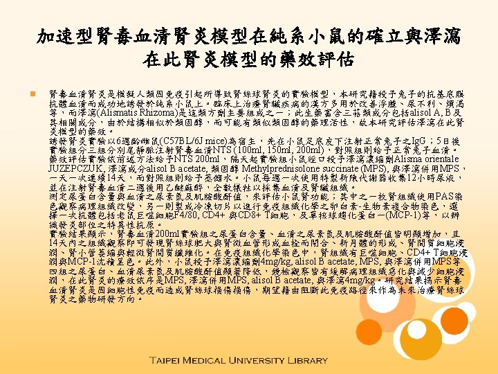 Establishment of the accelerated nephrotoxic serum nephritis in inbred mice and the effect of Alismatis Rhizoma on the nephritis n Nephrotoxic serum (NTS) nephritis is a well-established experimental model of human glomerular immune injury resulting in glomerulonephritis. First of two parts that the study to establish accelerated NTS nephritis that is produced in C 57 BL/6 J mice, using anti-murine glomerular basement membrane (GBM) rabbit antiserum. The Kampo therapeutics on renal disease to ameliorate symptoms such as edema, oliguria and thirst, and the Alismatis Rhizoma is the major component of these prescriptions. The herb contains active triterpenoids including Alisol A, B and their related compounds, have been reported regarding their therapeutic activities similar to steroids. Second of two parts that the study to evaluate the effect of Alismatis Rhizoma on the nephritis. In the first experiment, C 57 BL/6 J mice (6 weeks, females) was pre-immunized with the normal rabbit Ig. G in rear footpads. Five days later, mice were received intravenously injection with 100, 150 and 200 ml of NTS, respectively. Control mice were treated for normal rabbit serum. In the second experiment, a similar protocol was followed, but treatment with 200 ml of NTS. One day later, the experimental groups were administered orally the Alisma orientale JUZEPCZUK (AO), alisol B acetate, Methylprednisolone succinate (MPS) and AO combine with MPS once daily for 14 days. The control group was untreated by the same method. The urine of experimental animals was collected using metabolic cages once a week for 12 h. The mice were sacrificed under ether narcotization 14 days after the injection of NTS. Sera and kidney tissues were obtained at sacrifice. The urinary protein content, blood urea nitrogen (BUN) and serum creatinine (SCr) were determined. Renal tissues were served to histological examination (PAS stain), the glomerular changes and tubulo-interstitial (TI) changes were evaluated (0 to 4+) separately. The frozen sections used the Avidin-biotin-peroxidase complex (ABC) technique as immunohistochemistry stain. Choice the antibodies include murine F 4/80 macrophage, CD 4+ T cell, CD 8+ T cell, MCP-1 (monocyte chemotactic protein-1) to recognize the specific antigens, which deposited in inflammatory site. The result of the first experiment was revealed the urinary protein, BUN and serum creatinine in the NTS 200 ml group were significant increased. The histological examination was observed the typical NTS nephritis with cellular proliferation in glomeruli, occlusion of glomerular loops, crescents and tubulointerstitial changes within 14 days. In the ABC stain assay, cells that T-cell such as macrophage, CD 4+ T cell and chemokine which MCP-1 were localized in the renal tissues. In the second experiment, the urinary protein, BUN and SCr in the experimental groups which treatment AO extract 4 mg/kg, alisol B acetate, Methylprednisolone succinate (MPS) and AO combine with MPS were significant decreased versus NTS control group. On the other hand, the histological examination and the ABC stain assay were observed the alleviation in therapeutic groups. According to the following sequence, MPS was the priority effect, than AO combine with MPS, alisol B acetate, AO extract 4 mg/kg. The results were revealed the immune response of the NTS nephritis would be generates by cellmediated immunity injury and drug development by blocking the immunomediative pathway in the future.