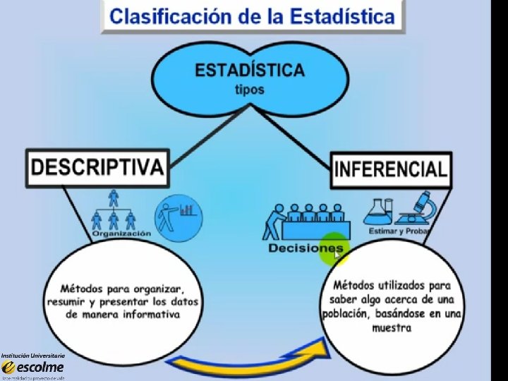 1. ¿Qué es estadística? • La estadística es un conjunto de técnicas y procedimientos matemáticos que estudia la recolección, análisis e interpretación de datos. Permite llevar a cabo el proceso relacionado con la investigación científica. Se usa para la toma de decisiones en áreas de: negocios, salud, demografía, de instituciones públicas, privadas e investigación, etc. • La información se recolecta, clasifica, organiza e interpreta. • Se tabula, procesa, grafica y analiza para la toma de decisiones.