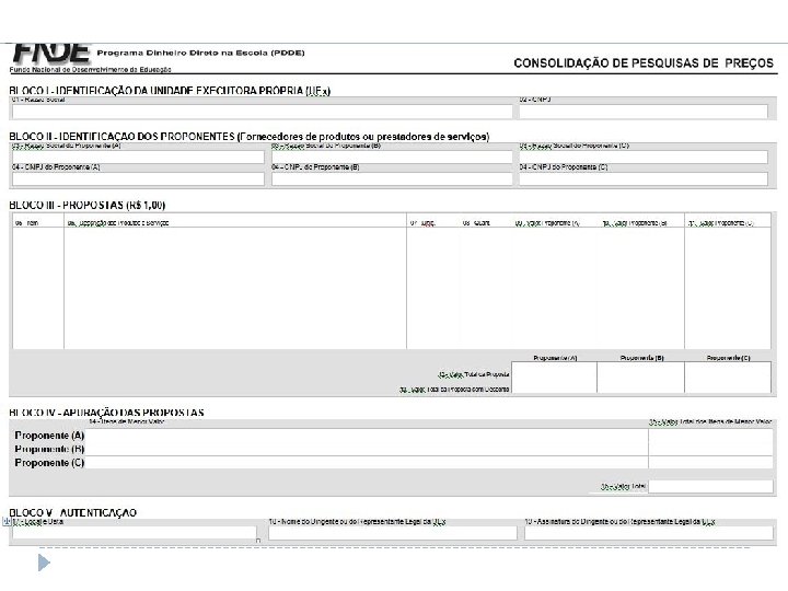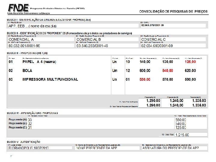 REGRAS PARA UTILIZAR O RECURSO ü Discutir e planejar com a comunidade, antes mesmo do seu depósito em conta; ü Selecionar as prioridades da escola; ü Registrar em ata toda e qualquer decisão; ü Fazer no mínimo 03 orçamentos de cada prioridade por item; ü Preencher o formulário de Consolidação de Pesquisas de Preço; ü Pagamento através de cheque nominal;