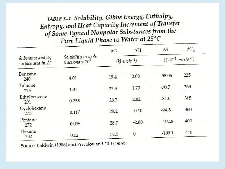 4 -10 kcal/mol 0 -200 kcal/mol 100 -400 kcal/mol Los efectos entalpicos y entrópicos contribuyen con fuerza parecida. Además son marcadamente dependientes de la temperatura