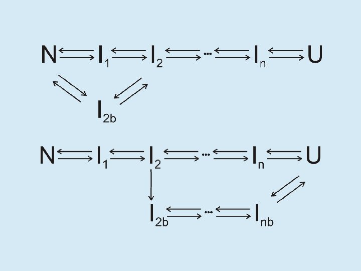 Estado desplegado (U) • Expansión máxima (5 -10 veces el volumen de N) Máxima superficie expuesta al solvente • No existen interacciones preferenciales entre residuos • Infinitas conformaciones • Estado ideal, modelo teórico que describe aproximadamente el comportamiento de muchas proteínas en condiciones fuertemente desnaturalizantes