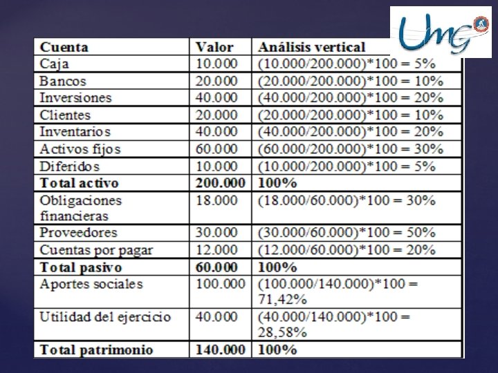 Análisis vertical Objetivo q q q El objetivo del análisis vertical es determinar que porcentaje representa cada cuenta en el total El análisis vertical de un estado financiero permite identificar con claridad como están compuestos los estados contables. Una vez determinada la estructura y composición del estado financiero, se procede a interpretar dicha información