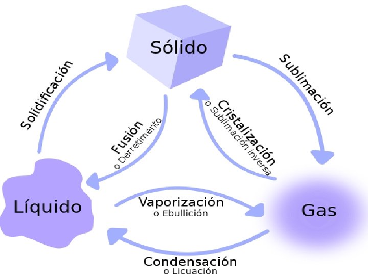 SUBLIMACIÓN Cambio de estado sólido a gaseoso sin pasar por el líquido. Al cambio inverso (gaseoso a sólido) se le llama sublimación regresiva, deposición ó cristalización.