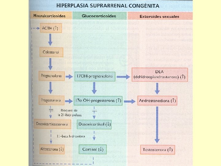 En el 95% de los casos es un déficit de 21 -hidroxilasa Herencia autosómica recesiva üla clásica de manifestación neonatal üCON O SIN perdida salina en ambos hay acumulo de metabolitos previos provocándose una virilización fetal y postnatal, üformas tardías que se manifiestan en la infancia o adolescencia,