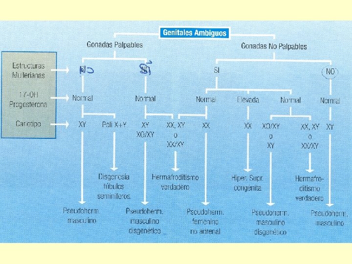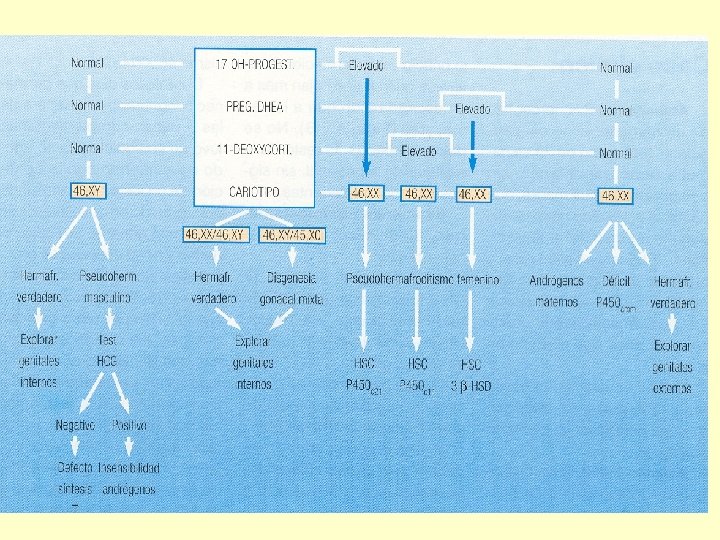 diagnóstico cariotipo XY • El diagnostico se orientara hacia un hermafroditismo verdadero o a un pseudohermafroditismo masculino; en este caso se debe diferenciar un defecto de la biosíntesis de la T o de insensibilidad periférica a los andrógenos, – un test de h. CG será útil para evaluar la capacidad de los testes en producir testosterona (T), : • Si no hay respuesta al la h. CG es característico de hipoplasia o agenesia de las células de Leidyg, en la que además se encontrará un LH elevada • Si el cociente anormalmente elevado de T/DHT sirve para detectar el déficit de 5 areductasa.