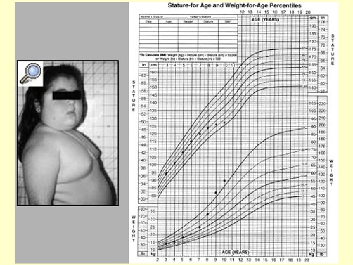 HIPERFUNCIÓN DEL CORTEX SUPRARRENAL • La detención de la velocidad de crecimiento y el retardo madurativo • obesidad progresiva y centrípeta – afecta 1º a cara y cuello y continua con el tronco, abdomen y piernas y se acompaña de estrías generalizadas • hipertensión arterial • Susceptibilidad a las infeciones • debilidad muscular, fatiga • en adolescentes hirsutismo y oligomenorrea. obesidad exógena, • más frecuente, • Existe un crecimiento normal o exagerado con maduración ósea normal o adelantada.