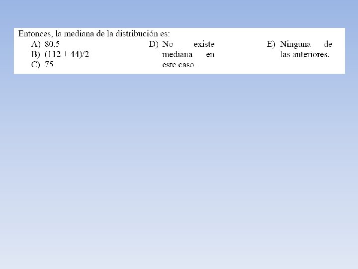 Mediana (Me) Sea X una variable por lo menos ordinal y sea x 1, x 2, …xn una muestra de tamaño n de observaciones de la variable, se define como Mediana "Me" un valor tal que supera a no más del 50% de las observaciones y es superado por no más del 50% de las observaciones, cuando estas han sido ordenadas según magnitud. MEDIANA PARA DATOS NO TABULADOS Ejemplo: Consideremos la edad en años de ocho personas 10 18 25 32 12 5 7 7 Para calcular la mediana , previamente se deben ordenar las observaciones. En este caso lo haremos en forma creciente: 5 7 7 10 12 18 25 32 Como la cantidad de datos es par, entonces la mediana corresponde al promedio de los datos centrales, por lo tanto la mediana es 11.