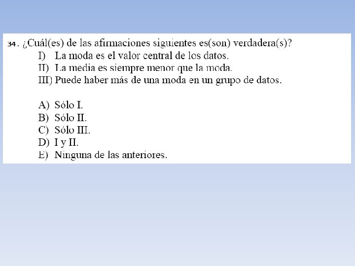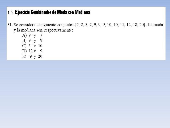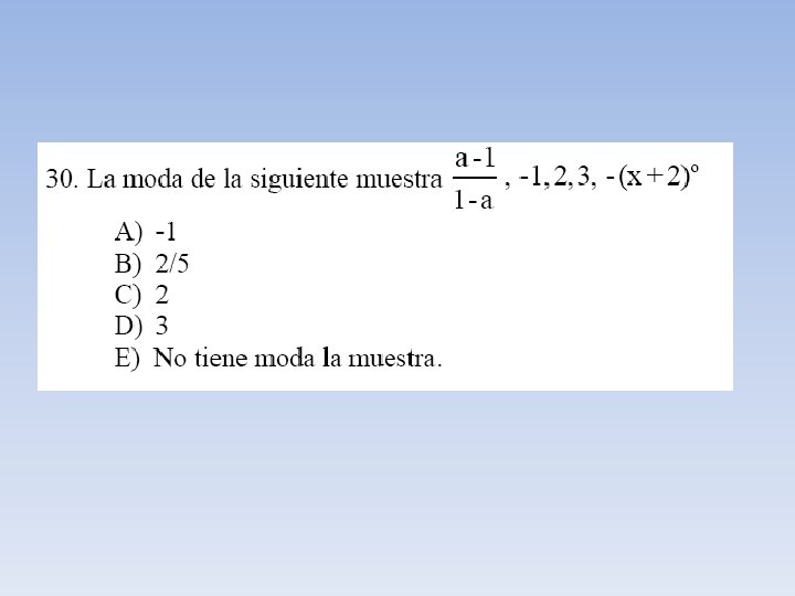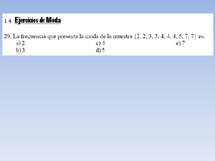 Moda o Modo (Mo) Como su nombre lo indica es aquel valor de la variable que tiene una mayor frecuencia. Si consideramos el ejemplo N° 2 del peso de una muestra de personas: 65 76 48 48 68 78 90 87 67 72 78 Mo = 48 kilos Mo = 78 kilos. Esto significa que la mayoría de estas personas pesa 48 kilos y 78 kilos. Esta distribución es bimodal.