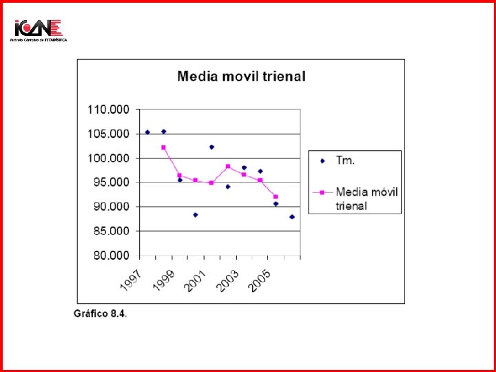 Media móvil centrada • Sirve para calcular tendencias • El número de periodos de la media móvil tiene que ser mayor que el periodo estacional • El valor de la media móvil trienal asignado a 1986: