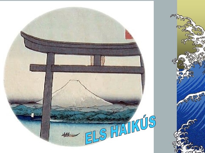 HAIKÚ Poesia tradicional japonesa. Es composa de 3 versos o “morai”, de 5, 7 i 5 síl. labes, que no rimen. Sol tenir una paraula clau, anomenada “kiro” relacionada amb la natura o la vida quotidiana de les persones. De vegades no hi ha cap verb, perquè explica emocions o impressions. El seu autor s’anomenma “haijin”. De vegades s’acompanyava amb una pintura senzilla, la “haiga”.