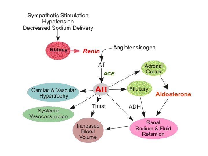 2 Mácula densa: Disminución de la carga sensada de cloro, sodio y agua 3 1 Flujo disminuido Hipovolemia relativa IECA-ARA II-DRI VD----CAIDA FF 4 Angiotensina II VC----FF 5 Vasoconstricción Absorción de agua y sodio