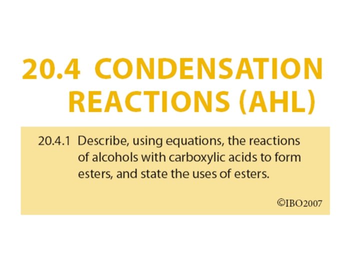 Polyesters • The two reactions discussed above are made use of in polymers known as condensation polymers. • In these polymers, two different functional groups are required and for each new bond between the monomer units (shown coloured below), a small molecule (often water) is produced. • Each monomer must also have two functional groups. • This can involve two different functional groups on the same monomer or more frequently, as in the examples below, two different monomers which have two identical groups on them. • One group of condensation polymers are the polyesters, so called because the bonding depends on the reaction of an alcohol with a carboxylic acid to form an ester. • The best known example of this polymer is Terylene, formed by the reaction of benzene– 1. 4–dicarboxylic acid with ethane– 1. 2–diol. as shown in Figure 1042(a) • The repeating unit in Terylene is therefore