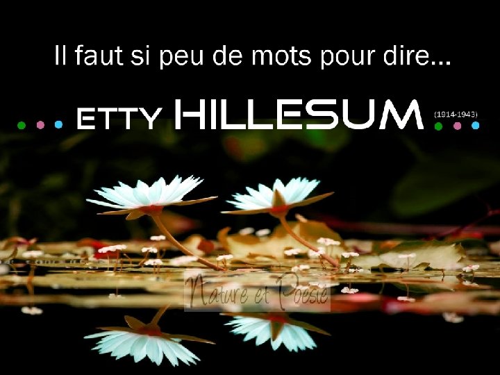 « De chaque instant naît un nouvel instant, qui comporte de nouvelles possibilités et s’avère parfois, de façon inattendue, être un nouveau cadeau. Et l’on ne doit jamais retenir ni prolonger inutilement un moment de malaise, parce que l’on risque d’entraver ainsi la naissance d’un moment plus riche. » « Il me semble parfois que toute situation nouvelle, qu’elle soit meilleure ou pire, «comporte en soi la possibilité d’enrichir l’homme de nouvelles intuitions. » � � �e t t y H I L L E S U M ��� (1914 -1943)