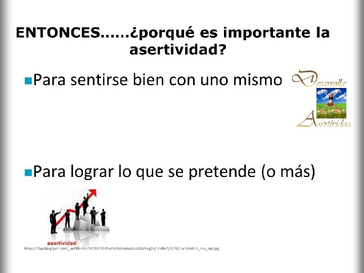 SUPONE: • Voz bien modulada • Habla fluida • Sin vacilaciones • Postura segura • Contacto visual firme ASERTIVIDAD Necesidades Deseos Opiniones Sentimientos creencias CAPACIDAD DE EXPRESAR LAS PROPIAS IDEAS DE FORMA APROPIADA, CON RESPETO A LOS INTERESES DE LOS DEMÁS Honesta Directa Una persona asertiva conoce sus derechos y los defiende, Respetando a los demás