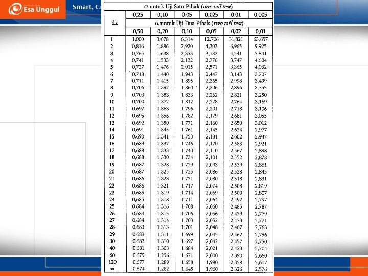 Distribusi t • Dalam hal (n < 25, σ tidak diketahui maka distribusi sampling kita asumsikan berdistribusi seperti distribusi " student, t" dimana untuk menentukan nilai "t" diperlukan disamping α juga derajat kebebasan (degree of freedom) yang besarnya n 1