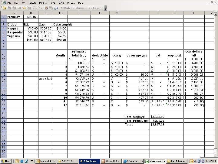 Replicating the Total Annual Cost Calculation (cont. ) Step 4: Apply the benefit month by month. – – – Add total monthly drug costs for all drugs. Multiple by 12 to get the total annual drug costs. This will tell you whether the person has sufficient drug costs to meet the $250 (or other) deductible and/or the $2, 250 ICL. Determine how many months it will take to meet the deductible divided by total monthly drug costs by the $250 (or other) deductible Compute the drug costs for month in which the deductible is met and the initial coverage period begins. Determine how many months it will take to meet the ICL Compute the drug cost for month in which the ICL is met and the gap period begins. Step 5: Add total annual premium + total annual non-formulary drug costs + total drug out of pocket costs to get total OOPC
