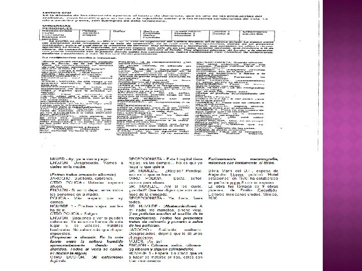 Desarrollo (lectura y análisis) 1. 2. 3. • Comentarios sobre sus conocimientos o experiencias en las salas de urgencias por medio de lluvia de ideas. • Lectura dramatizada en forma grupal de la obra a partir de la colaboración individual, o asignada según el caso del grupo(representación de papeles, kinestésico y verbal ). • Análisis individual de la obra a partir de preguntas relacionadas con el contenido y los contextos de producción y recepción(relación con el contexto del alumno).