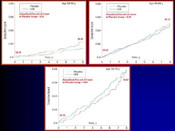 Cardioprotective Effect of HT According to Age and Timing of initiation In the WHI-estrogen alone trial, hysterectomized women randomized to daily conjugated equine estrogen 0. 625 mg (CEE) therapy within 10 years of menopause had a 52% reduction in CHD events and those randomized between 10 -20 years after menopause had a 4% reduction in CHD events and those randomized more than 20 years after menopause had a 12% increased risk of CHD, all relative to placebo treated women.