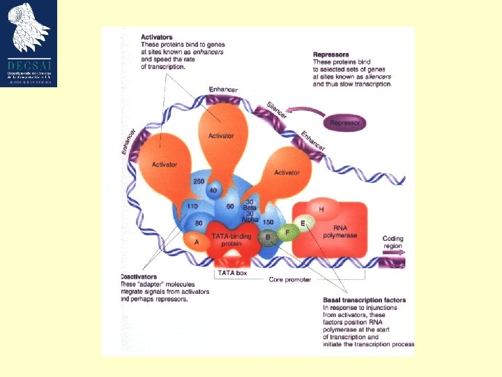 Estructura de un gen eucariota • TATA box located at – 25 – TATA(A/T) – Recognized by TATA-binding protein • Initiator sequence at +1 – YYCARR; Y is C/T, R is G/A – +1 is usually the A • Transcription factors bind to promoters – Position specific scoring matrix (PSSM) • Possible distant regions acting as enhancers or silencers (even more than 50 kb). – More complex mechanism than prokaryotes