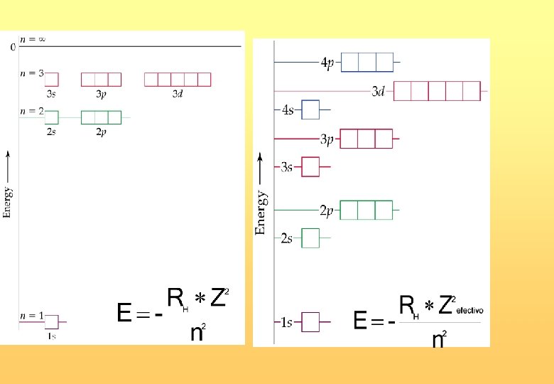 Números cuánticos Orbital • n: principal 1, 2, 3, . . . , . • l: azimutal 0, 1, . . . , n-1. • ml: magnético –l, -l+1, . . . , l-1, l. • ms: spin – 1/2, +1/2. Los números cuánticos están relacionados don distintas propiedades de los estados electrónicos. La solución de la ecuación de Schrödinger muestra que para el átomo de hidrógeno el estado caracterizado por el conjunto (n, l, ms) tiene una energía dada por: