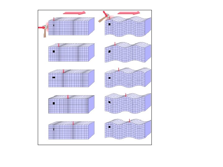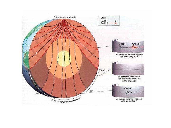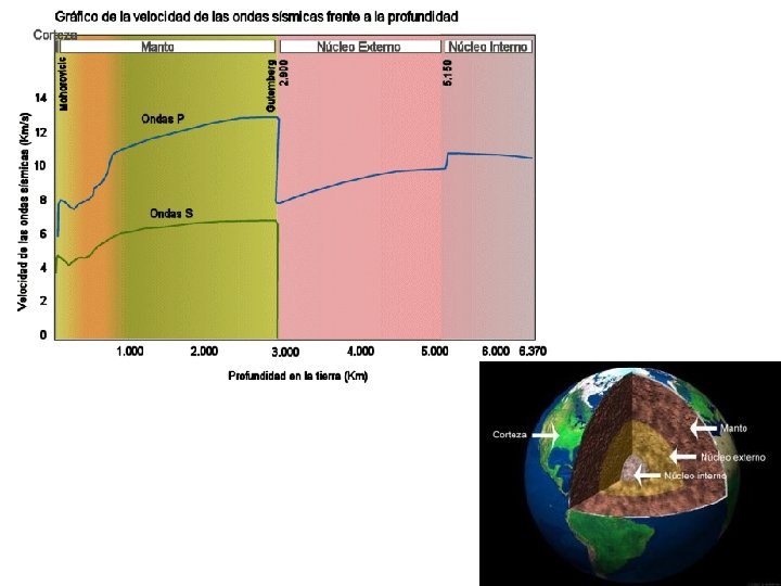 Sísmics: Ens ha donat la major part de les dades de l'interior del planeta gràcies als terratrèmols o explosions provocades artificialment. Un terretrèmol és un moviment brusc dels materials terrestres com a resposta d'una tensió acumulada. L'energia generada per un terratrèmol es transmet per l'interior i la superfície del planeta mitjançant una sèrie de vibracions anomenades ones sísmiques. Aquestes ones poden travessar varies vegades la Terra, rebotar en el seu interior (reflexió) i desviar la seua trajectòria (refracció). Podem distingir tres tipus d'ones: * Les ones P, longitudinals o primàries: són les primeres en ser registrades pels sismògrafs. En passar l'ona P, la roca o un líquid es comprimeix i s'expandeix únicament en la direcció de l'ona. • Les ones S, transversals o secundàries són més lentes que les anteriors i vibren en sentit perpendicular moviment ondulatori. El comportament d'aquestes ones depén de l'elasticitat del medi, per la qual cosa únicament poden travessar masses sòlides, ja que els fluids no presenten propietats elàstiques. • Les ones L o superficials. Causen les destroses a la superfície