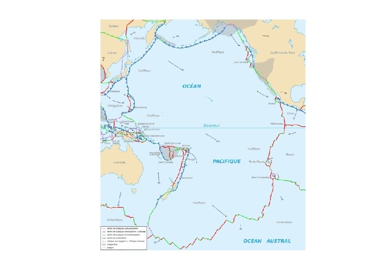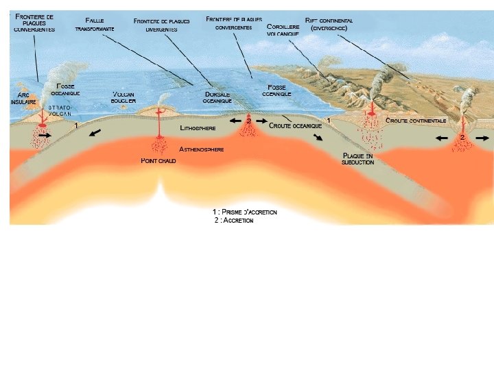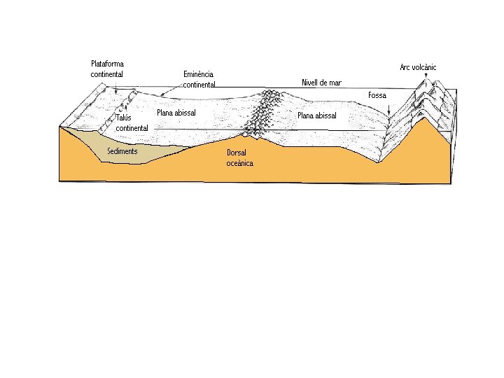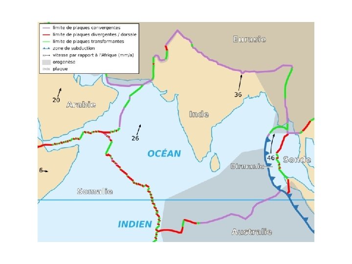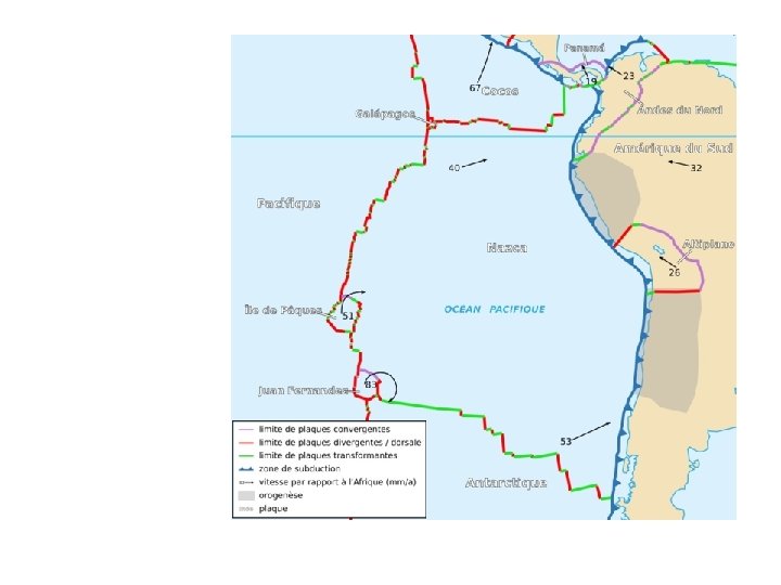 Límit convergent o destructiu Les plaques xoquen. • Quan una placa oceànica (més densa) xoca contra una continental (menys densa) la placa oceànica és empesa sota, formant una zona de subducció. A la superfície, la modificació topogràfica consisteix en una fossa oceànica en l'aigua i un grup de muntanyes a terra (Andes). • Quan dues plaques continentals col·lideixen, es formen extenses serralades. La cadena del Himàlaia és el resultat de la col·lisió entre la placa índica i la placa eurasiàtica. • Quan dues plaques oceàniques xoquen, el resultat és un arc d'illes (per exemple, Japó)