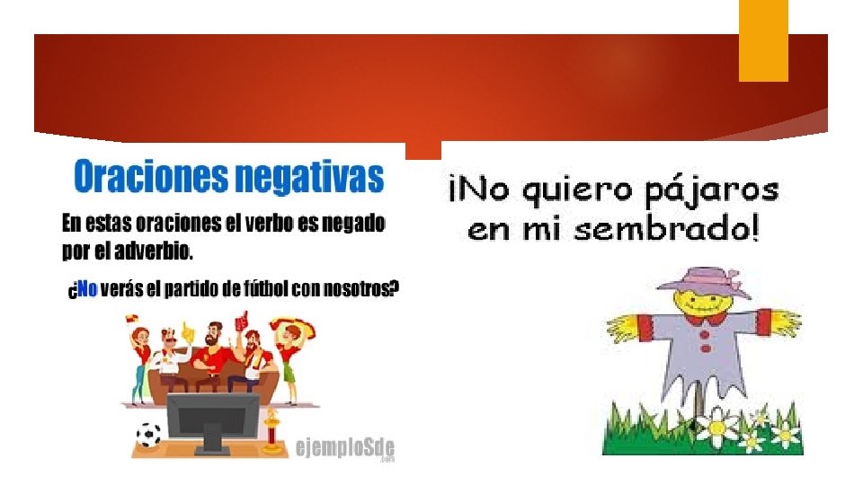 Afirmativas Negativas (simple) � Tengo hambre � Quiero un pastel � Puedo salir a jugar � El carro es rojo � El perro es grande � Yo estoy en la escuela � Ellos van a la fiesta � Ustedes estan en cine