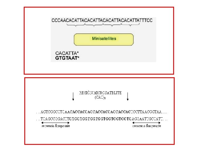 En Tándem… CLASE NÚMERO DE BASES REPETIDAS NÚMERO DE COPIAS O REPETICIONES LOCALIZACION ADN satélite 5 a 171 106 Centrómero ADN telomérico 6 104 Telómero ADN minisatélite 6 a 24 102 - 103 Telómeros, En todos los cromosomas ADN microsatélite 1 a 4 105 En todos los cromosomas
