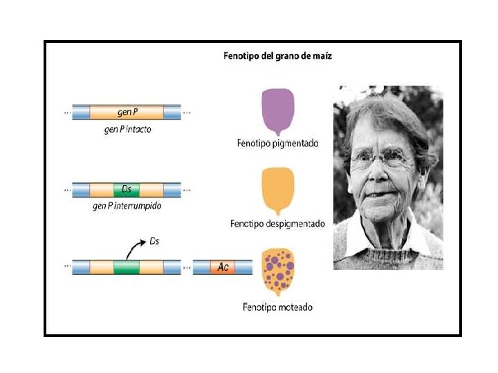 En 1950 Barbara Mc. Clintock descubre los elementos transponibles Ac controla la transposición de Ds y si Ds no está presente, se expresa el color de la aleurona del maíz. Unidades de control, o elementos reguladores. Activator (Ac) Dissociator (Ds)