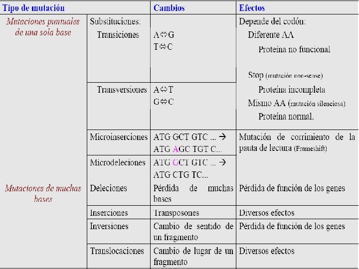 CONSECUENCIAS DE LAS MUTACIONES EN LA SÍNTESIS PROTEICA • Mutación Silenciosa: Tripletes que codifican el mismo aminoácido. Ej: AGA (Arg) CGA (Arg) • Mutación Cambio de Sentido: Tripletes que codifican para aminoácidos de distinto tipo. La proteína pierde su función. • Mutación Sin sentido: Aparece un triplete de STOP. Ej: CAG(Gln) UAG (STOP) • Mutación Cambio de marco de lectura: Adición o deleción de un único par de nucleótidos o de varios pares de nucleótidos, siempre que no sean múltiplos de tres. • Mutación sin Cambio de marco de lectura: Adición o deleción de un único par de nucleótidos o de varios pares de nucleótidos, siempre que sean múltiplos de tres. • Mutación de Terminación retrasada: Se pierde un triplete de STOP.
