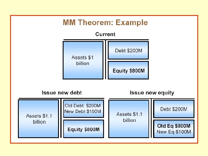Modigliani – Miller – Teorema de Irrelevancia del financiamiento • El teorema de MM fue originalmente pensado para evaluar el efecto de la estructura financiera. • Actualmente puede aplicarse a todos los aspectos de la política financiera: Ø Irrelevancia de la estructura de capital Ø Irrelevancia de la relación deuda a corto y largo plazo Ø Irrelevancia de la política de dividendo Ø Irrelevancia de la administración de riesgo • Las conclusiones de MM se aplican a todas las transacciones financieras porque ellas implican un VAN igual a cero.