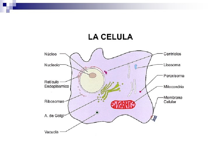 n n Las células eucarióticas son más complejas que las células procarióticas. Las células ecucarióticas poseen sus organelos rodeados por una membrana que permite que cada uno de ellos esté especializado para llevar una actividad en particular El núcleo n Generalmente es el organelo más conspicuo de la célula. Está rodeado por una membrana doble llamada membrana nuclear, la misma que posee unos poros o aberturas a través de las cuales algunas moléculas pasan desde el núcleo al citoplasma y viceversa. n Dentro del núcleo se encuentra una estructura irregular llamada nucleolo. n Dentro del nucleolo se almacena el ARN, ácido nucleico muy importante para la síntesis de las proteínas. n Además del nucleolo, dentro de la célula eucariótica se encuentra un material llamado cromatina que está formado por proteínas y ADN. n Durante la división celular, la cromatina forma una estructura en forma de hilo llamada cromosoma.