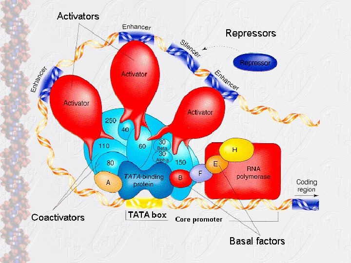 Control transcripcional: conceptos básicos • Promotor: Secuencia de nucleótidos del ADN en la que se une la ARN polimerasa para iniciar la transcripción • Caja TATA: Secuencia unos 30 pares de bases arriba del sitio de inicio de la transcripción • Elemento promotor ascendente (UPE): Secuencia de 8 -12 pares de bases, a corta distancia arriba del sitio de unión para ARN polimerasa • Elemento intensificador o facilitador: Secuencia a miles de bases del promotor que es capaz de aumentar la rapidez de la transcripción