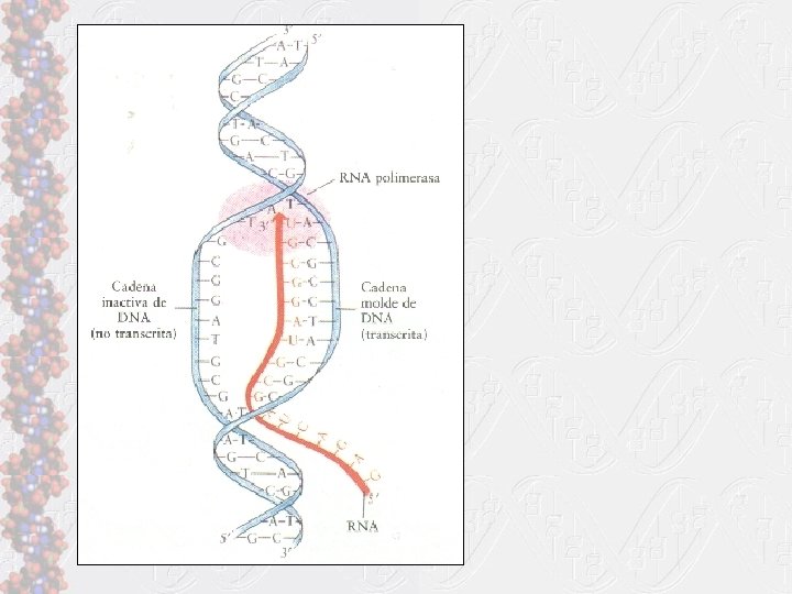 (5)’ CGCTATAGCG (3’) cadena codificadora del DNA (3’) GCGATATCGC (5’) cadena molde del DNA (5’) CGCUAUAGCG (3’) transcrito de RNA