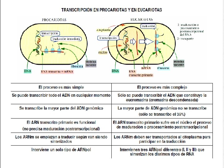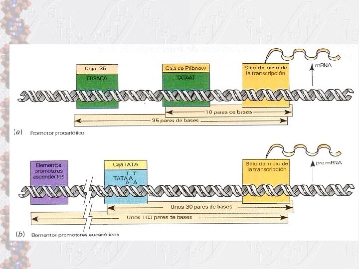 • Iniciación: • Secuencias promotoras (se une la RNA polimerasa) • Procariotas: Secuencias consenso Pribnow (-10 pb) y región -35 pb • Eucariotas: Caja TATA (-25 pb) y CAAT (-70 pb) • Elongación: • 5’->3’ • Enrollamiento aguas arriba (5’) y desenrollamiento aguas abajo (3’) del DNA • Terminación: • Dependiente del factor Rho • Independiente de Rho