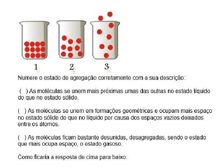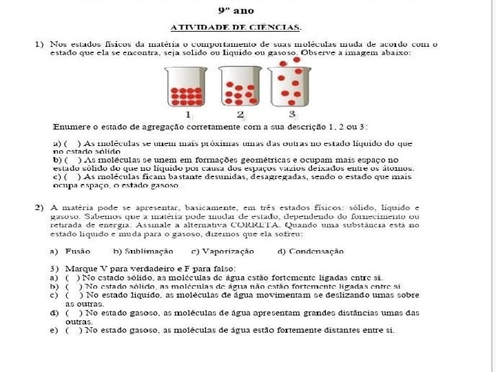 ATIVIDADE • 7º Questão • Sobre as mudanças de estados físicos da matéria julgue os itens: • 1. ( ) A mudança de estado gasoso para líquido recebe o nome de condensação. • 2. ( ) Quando um corpo passa diretamente do estado sólido para o gasoso observamos uma sublimação. • 3. ( ) Fusão é o nome dado à mudança do estado sólido para o líquido.