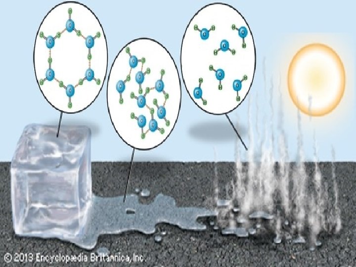 ESTADO LÍQUIDO • No estado líquido da água, as moléculas têm força de ligação mais fraca que no estado sólido. As moléculas se agitam mais e rolam umas sobre as outras. O volume é determinado pelo recipiente que a contém.