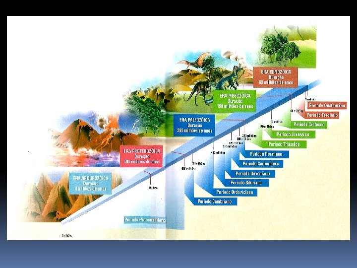 Supõe-se que a Terra tenha 4, 6 bilhões de anos. Um milhão de anos após sua formação, a superfície da Terra já apresentava um aspecto semelhante ao atual, com rochas, oceanos e uma temperatura não muito diferente da que existe na atualidade. Para estudar a longa vida da Terra, conhecida como tempo geológico, dividiu-se o tempo em unidades chamadas eras. As eras, por sua vez, foram divididas em períodos, e os períodos em épocas. Cada era se caracteriza pela forma como se encontravam distribuídos os continentes e os oceanos, e pelo tipo de organismos que neles viviam. As eras geológicas são: Pré-Cambriana (a mais antiga), Paleozóica, Mesozóica e Cenozóica (a mais recente).