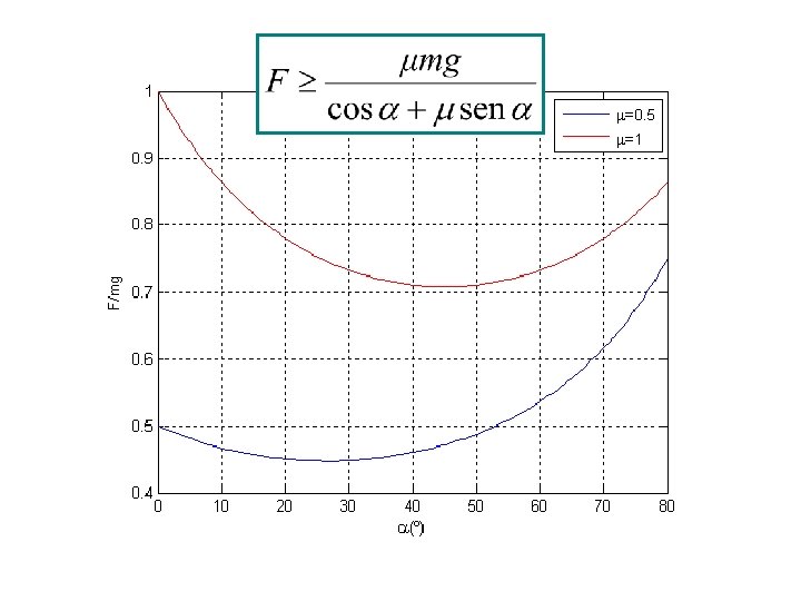 Una persona intenta arrastrar una caja de masa M atando una cuerda alrededor y tirando de ella formando un ángulo con la horizontal. Determine la mínima fuerza que tiene que aplicar para iniciar el movimiento si el coeficiente de rozamiento estático es . …en la condición límite que se solicita
