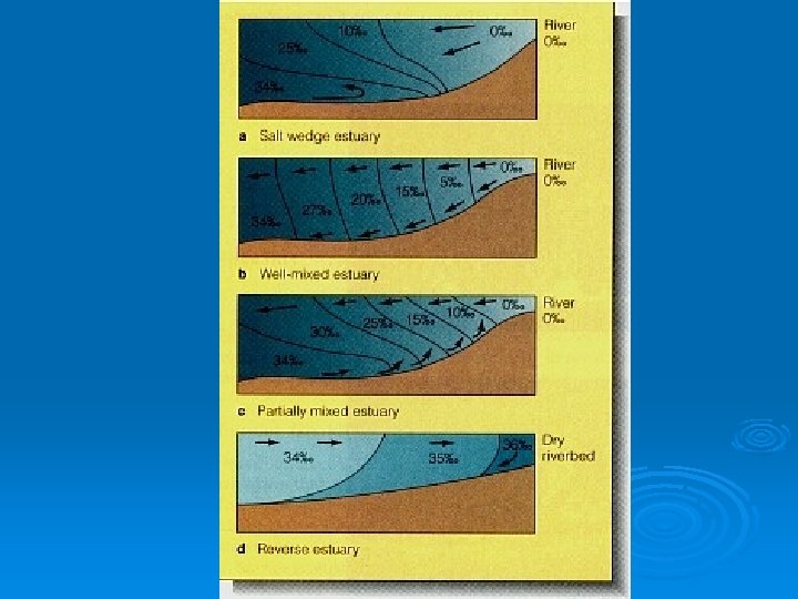 Classification Ø Estuaries can be grouped into classes, according to their circulation properties and the associated steady state salinity distribution. The most important estuary types are 1. salt wedge estuary (R>>V) 2. highly stratified estuary (R>V) 3. slightly stratified estuary (R<V) 4. vertically mixed estuary (R<<V) 5. inverse or reverse estuary (R=0)