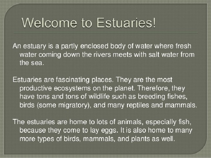 SUMMARY � Located along the shoreline where fresh water from a river meets salt water from the ocean. � Estuaries have twice the amount of life. � Estuaries are great places for organisms to lay eggs, have babies, and raise their young. � Estuaries absorb lots of water. � Estuaries absorb lots of pollution coming from a river. � There are two types of estuaries: salt marshes and mangrove forests.