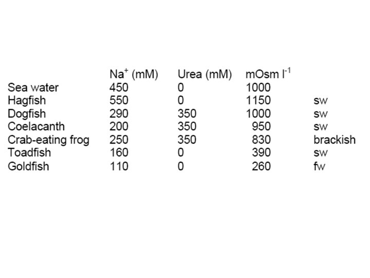 Marine Elasmobranchs & Holocephalans • [Salt] at about 1/3 of seawater • Osmotic equilibrium achieved by the addition of large amount of organic compounds – primarily urea (0. 4 M) – various methylamine substances • 2 urea : 1 TMAO • trimethylamine (TMAO), sarcosine, betaine, etc.