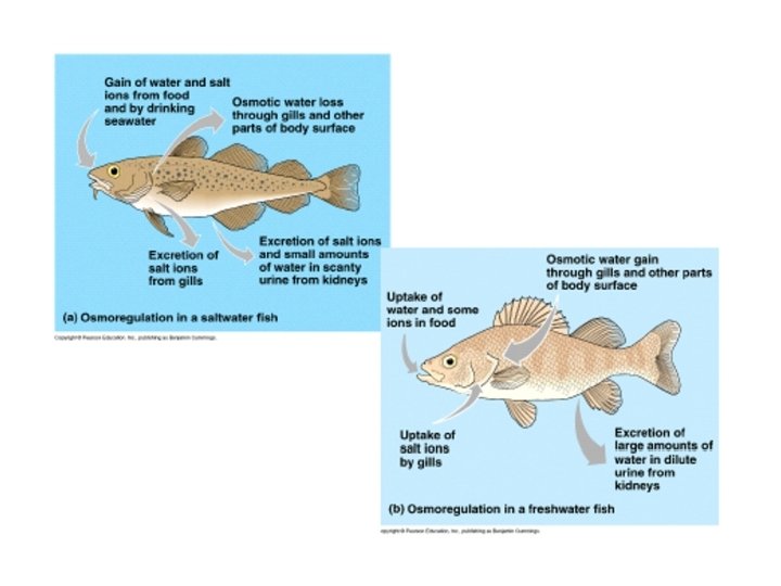 • Kidney cannot produce urine that is more concentrated than the blood • Need special organ, the gills • Active transport requires energy • Water loss from gill membrane and urine • Fish drink to balance the water deficits • Na and Cl secreted via the gill’s chloride cells • Gut: for elimination of divalent salts