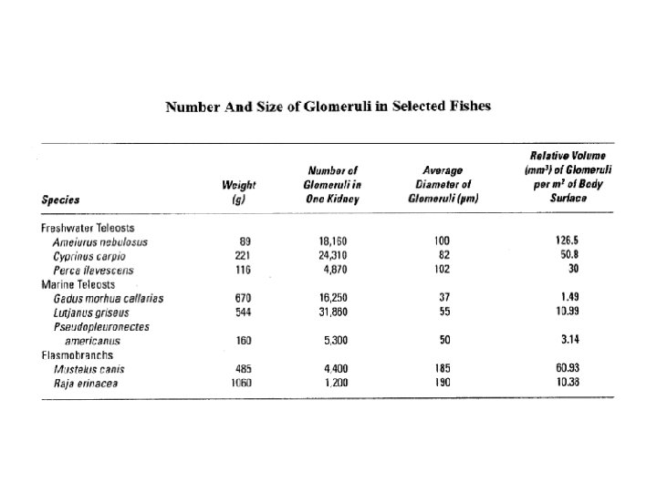 Marine teleosts • Hyposmotic, constant danger of losing water to surrounding via the gill surfaces • Compensate for water loss by drinking • Salts are ingested in the process of drinking • Gain water by excreting salt in higher concentration along the length of its convoluted tubules • Produce small amount but very concentrated urine – 2. 5 ml/kg body mass/day