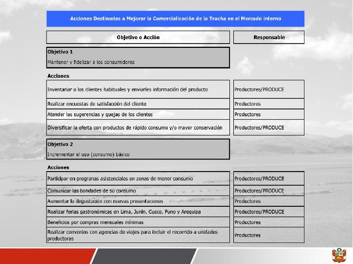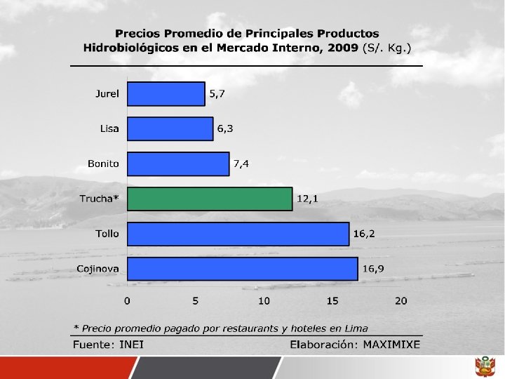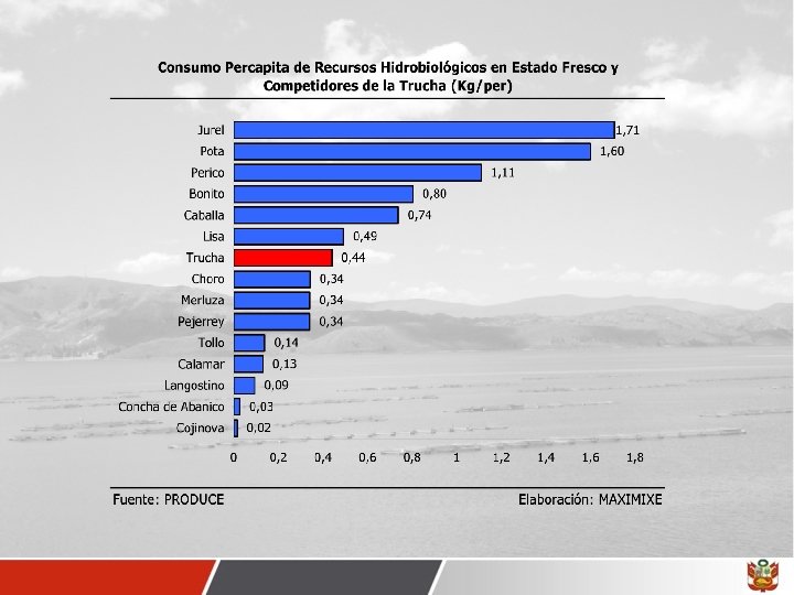 DETERMINACION DE LA OFERTA DE TRUCHA 14, 000 12, 817 12, 000 10, 000 8, 000 6, 000 4, 000 1, 928 2, 000 0 2001 2002 2003 A Nivel Nacional 2004 2005 2006 2007 2008 Puno tuvo el 74%, Junín el 14%, Huancavelica el 1, 93%, Pasco el 1, 41%, Lima el 1, 15% 2009