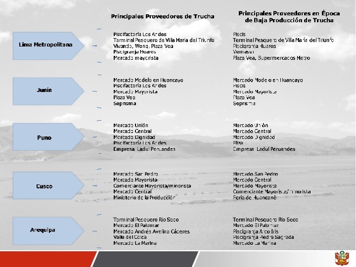 OFERTA DE TRUCHA FRESCA ENTERA EN LAS REGIONES DE ESTUDIO El estudio menciona que la oferta de este tipo de producto tiene un precio de S/. 9, 5 x kilo podría triplicarse en los próximos cinco años teniendo como principal destino Cusco, Arequipa y Desaguadero (Bolivia)