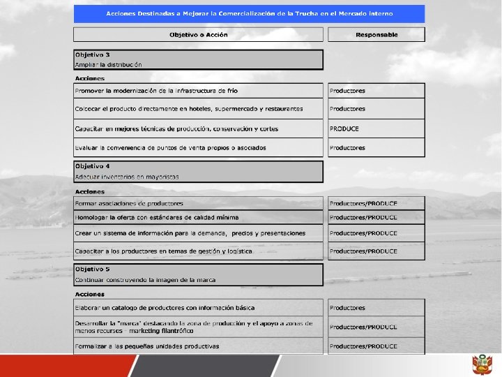 • La crianza de trucha en los últimos 5 años ha presentado un crecimiento vertiginoso, principalmente en las regiones de Puno y Junín, pues entre ambos constituyen alrededor del 85% de la producción nacional • En relación a la producción de truchas de las demás regiones (Cusco, Arequipa y Lima), actualmente es incipiente (en el 2009, la producción de las tres regiones no superaron las 500 TM), debido principalmente a la falta de apoyo de la región y del sector privado. Sin embargo, estas regiones representan zonas potenciales para desarrollar la truchicultura a niveles comerciales • En el análisis de los canales institucionales, la principal razón que determina la compra de trucha es la frescura del producto (75%) y entre el 50 y 75% señala que es el tamaño. Las presentaciones más demandadas son la trucha fresca-entera y la trucha fresca entera eviscerada • De continuar el dinamismo de la demanda interna, a partir del 2012, habría un déficit en el abastecimiento en el mercado local.