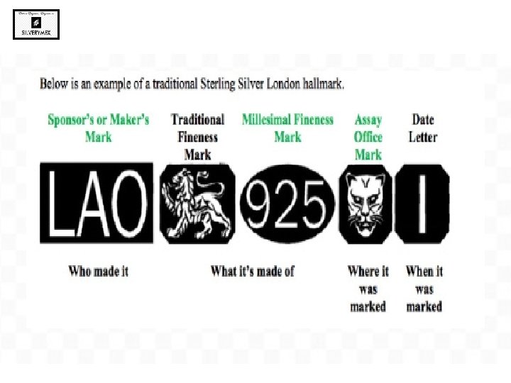• El contraste consiste en una serie de signos/sellos que se estampan en todos los artículos de oro, plata (mayores a 8 grm) o platino que se van a vender en territorio británico una vez han sido comprobados. Los fabricantes que deseen comerciar con este tipo de piezas deben registrarse en una oficina de ensayo, que les proporciona un punzón personal con el que grabar sus iniciales o las de su empresa. *En el caso de SILVERYMEX, estamos registrados en The Goldsmiths’ Company Assay Office de Londres, Inglaterra. • El punzón garantiza que el fabricante cumple con la pureza establecida, ya que, en caso contrario, la oficina en la que esté registrado el exportador/productor tiene potestad para fundir la pieza o marcarla con una ley menor. • El contraste está formado por 4 ó 5 sellos: la marca del fabricante, la de ley, la ciudad de la oficina ensayadora y la letra correspondiente a la fecha, e incluso el sello típico de finura.