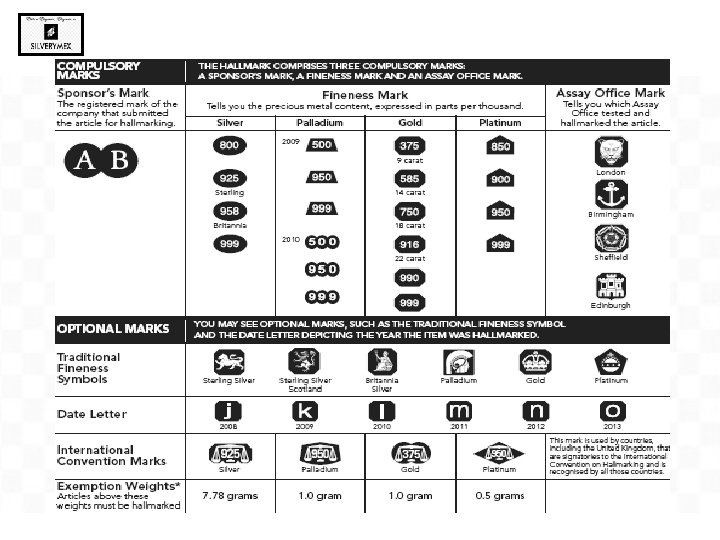 v Para joyería de alta calidad se aplica un proceso especial de ensayo y marcado, existiendo sellos de contraste para la joyería de oro y plata, los cuales son obligatorios en Reino Unido. v La convención de Viena sobre control común de sellos (Common Control Mark – CCM), puede ser aplicada a los metales preciosos por organizaciones de análisis en los países miembros a la hora de importar o exportar joyería de alta calidad dentro y fuera de la UE. Existen varios sellos de calidad CCM para oro, plata, platino y paladio que definen su pureza. Los actuales países miembros del convenio son: Austria, República Checa, Dinamarca, Finlandia, Irlanda, Holanda, Noruega, Portugal, Suecia, Suiza y Reino Unido. Al estar incluido Reino Unido dentro de esa normativa, SILVERYMEX, debe cumplir con tales exigencias, si es que se desea comerciar con piezas cuyo gramaje sea mayor a los 8 grm, dado que las piezas inferiores a este peso están exentas del Hallmarking (marcaje/contraste)