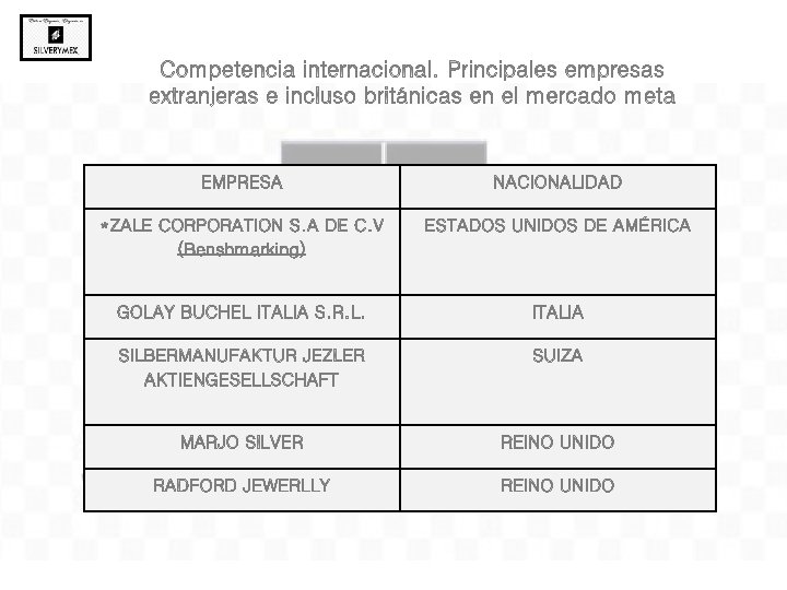 Con base en datos extraídos del directorio de Exportadores de Bancomext existen aproximadamente 124 empresas mexicanas exportadoras de plata, de las cuales 37 exportan a Reino Unido, por lo que se les puede considerar como nuestra competencia directa. A continuación, las más importantes: